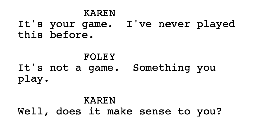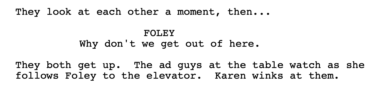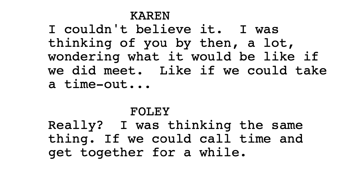 — which makes sense when the line is the halfway point of the sequence. By then, Foley is still rolling the dice that Karen won’t reject him or worse (maybe?) arrest him, so he’s pressing his luck with the suggestion; Karen, for her part, is letting herself into the situation only gradually and, as scripted, still has a ways to go.
