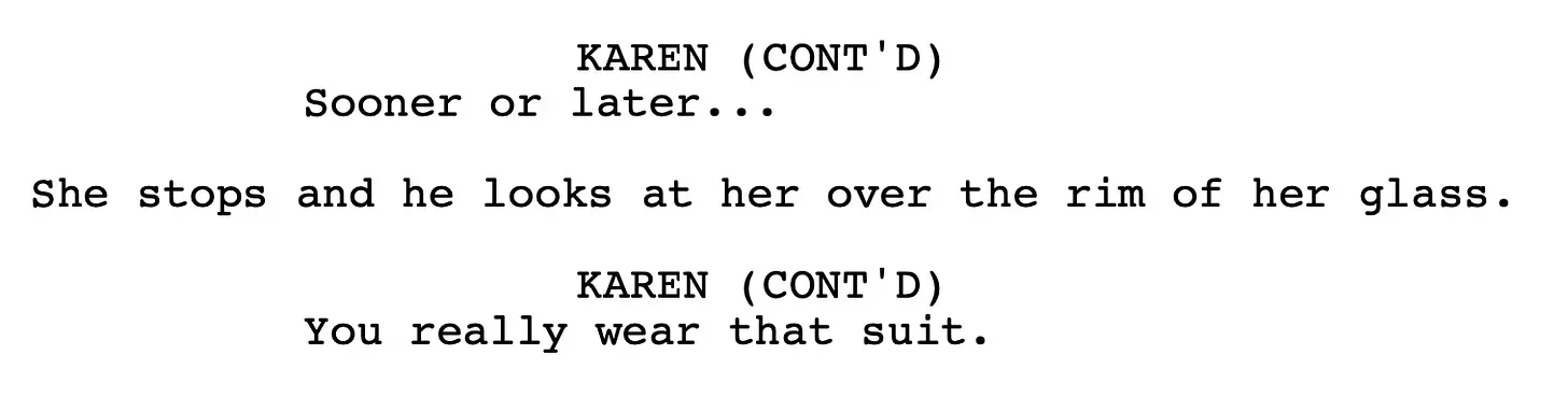 It’s also Karen who sits back from the bar table two-shot (Davis panning with her - Karen’s not getting out of it this easily), thinks for a moment, then lowers the boom: