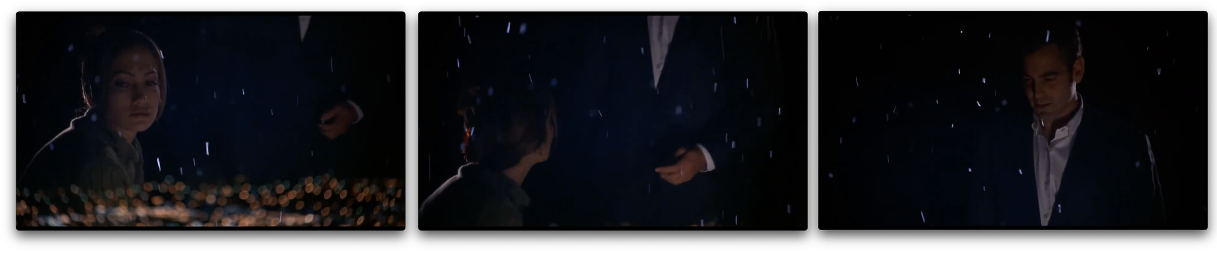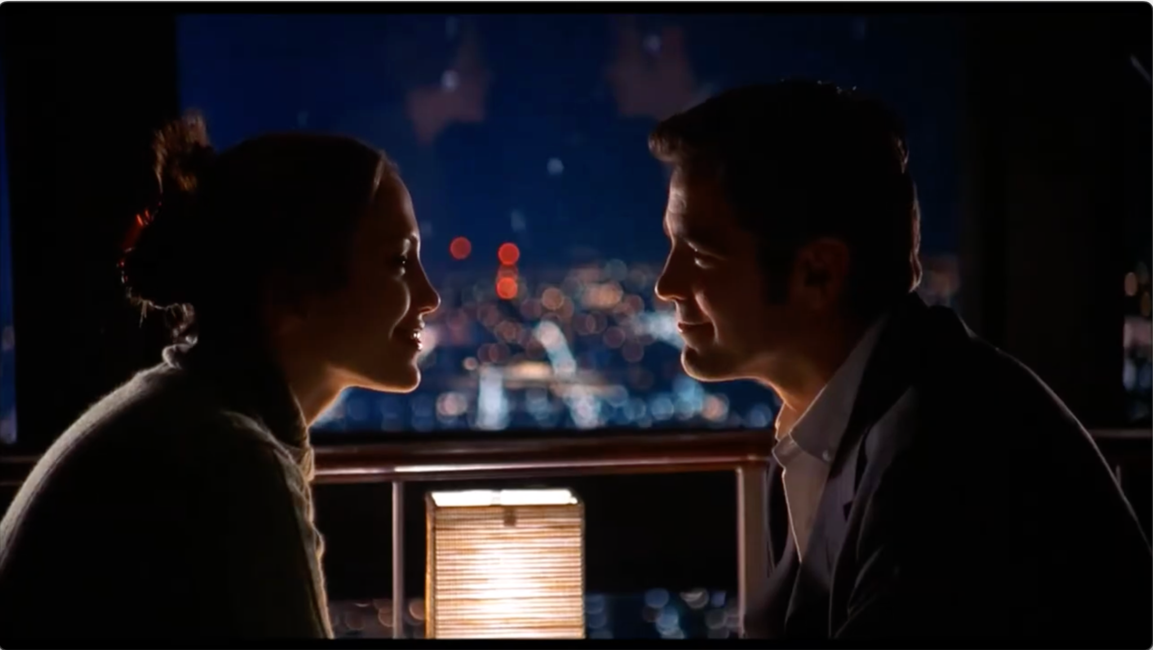 The scene opens out of focus (Soderbergh and Davis relentlessly play with focal planes and framing throughout), panning across distant city lights and falling snow, to arrive at Karen Sisco in profile, lost in thought, her face a mix of candlelight and shadow.