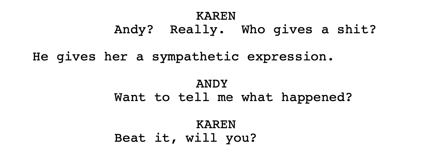 Here, Andy reads even fewer cues than Philip did, and sits in the chair opposite Karen, humblebragging about the sales trip he and his buddies are on, and while it’s all fascinating to him (a fascination he’s sure will come across to Karen), she’s less polite than she was with Philip: