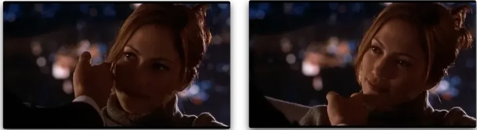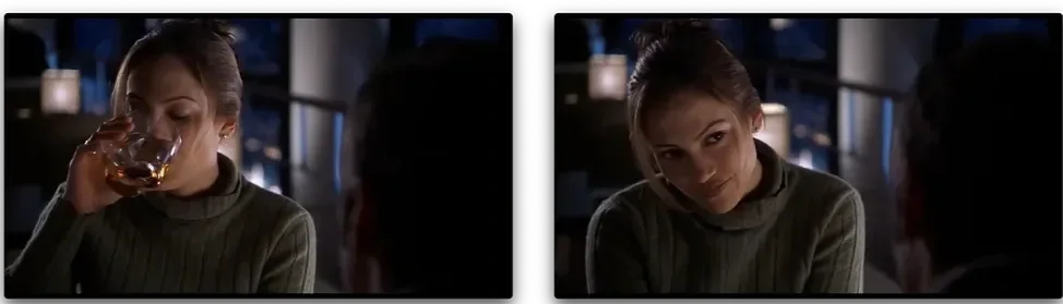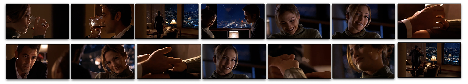 Their dialogue continues as a teasing series of advances and retreats, intercutting attitudes between the hotel bar and the hotel room. Karen brings her drink out from under Foley’s hand (retreat), looks away to take a swig (retreat) and then fixes him with a “your move” look (advance) in a series of hairpin turns in about three seconds of screentime.