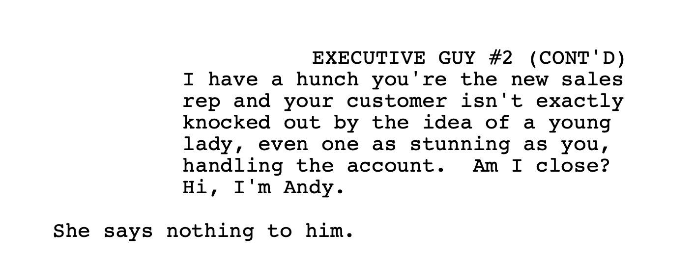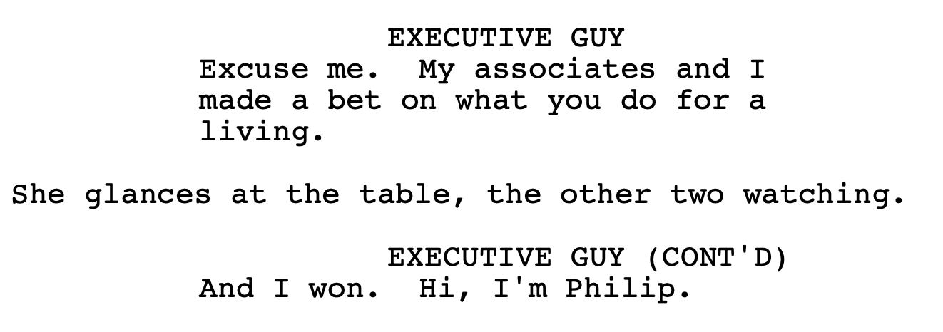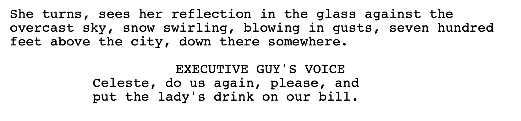 She orders a bourbon, water back (Jack Daniel’s in the script, made generic one assumes to avoid product placement) from the server, a pretty blonde named Celeste.