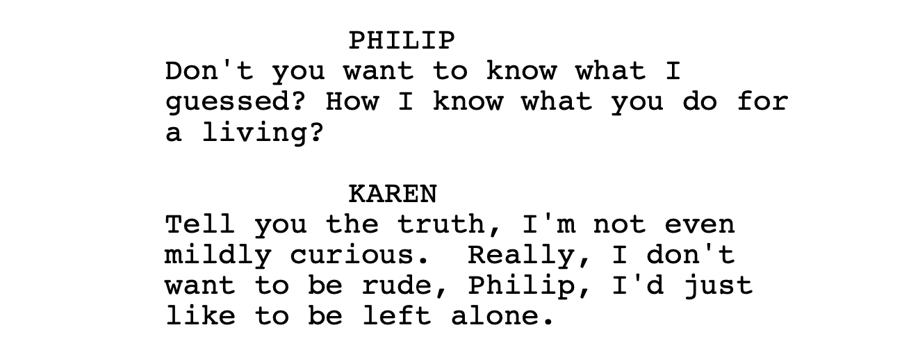 NOW: here’s where script and movie deviate. In Frank’s rendition, once Karen agrees to Jack’s thesis, Jack makes a move …