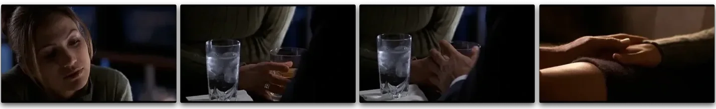 As Karen contemplates Jack’s thesis, he sets his hand over hers, and we match cut to the hotel room - change in axis, softer/warmer light - where he lays his hand over hers, this time not on her drink, but on her thigh.