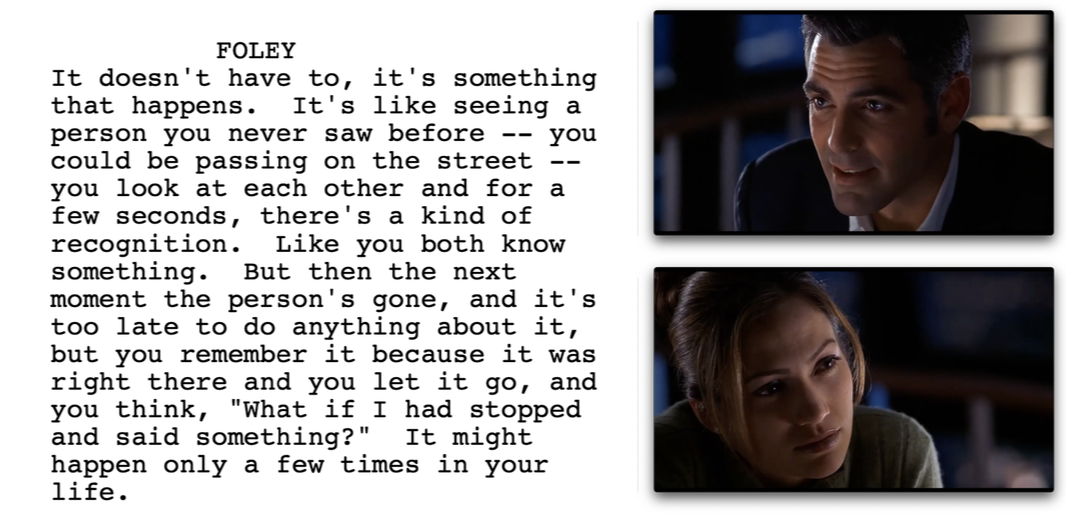 Foley, grappling with the path that has brought him here with so little to show for it, tracks Karen down to her hotel, finding her being relentlessly hit on in the hotel bar, and the two carve out their “what if?” moment, in a scene that’s at once straight out of the book, verbatim from the script page, and yet wholly brought to cinematic life in the unified process of adaptation, production and post-production.